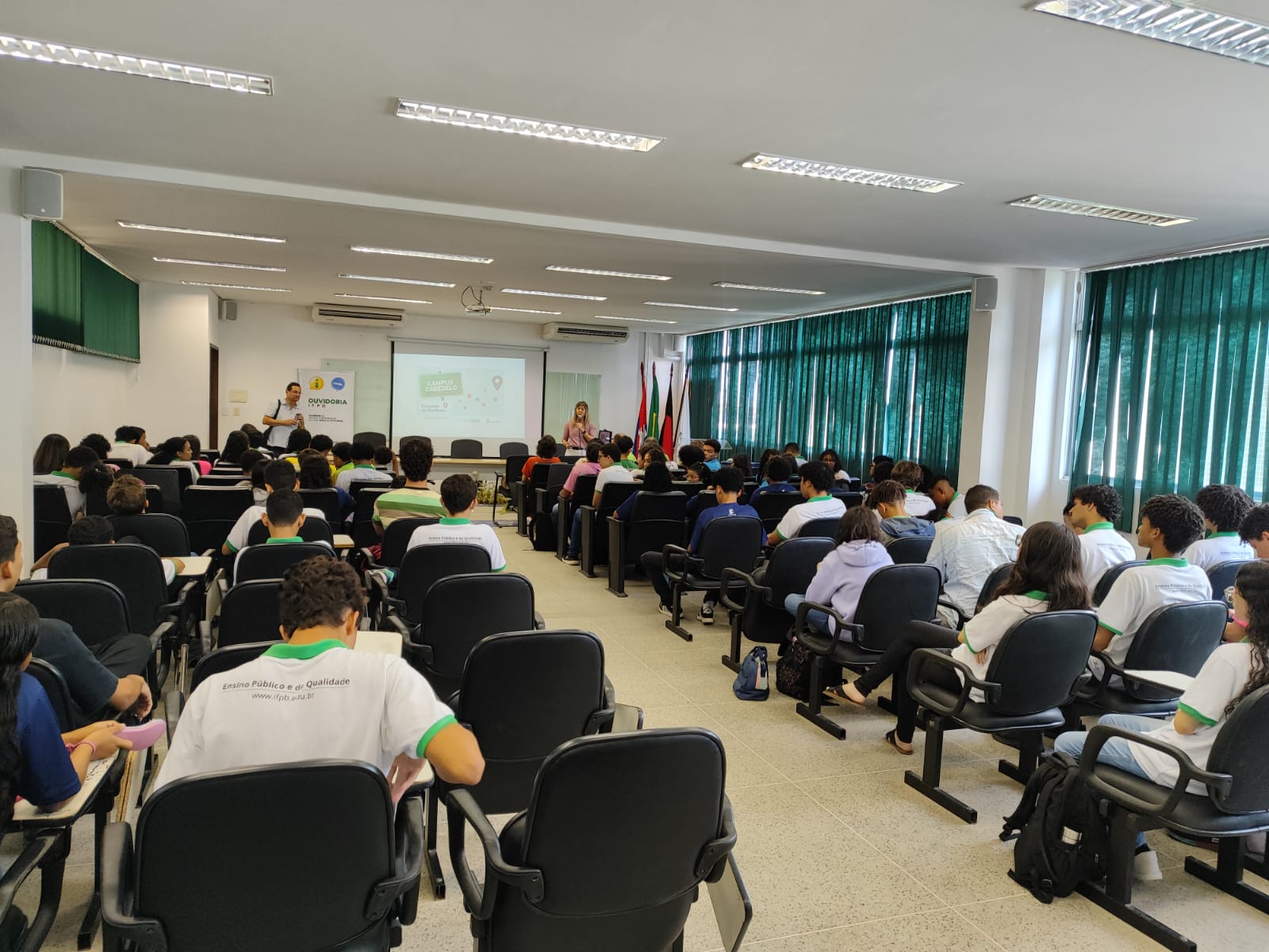 No auditório do Campus Cabedelo a Ouvidora Edezilda Sales apresentou aos estudantes o papel da Ouvidoria, falou sobre a Plataforma Fala BRGuia Lilás, material orientador sobre assédio moral e sexual na administração pública.