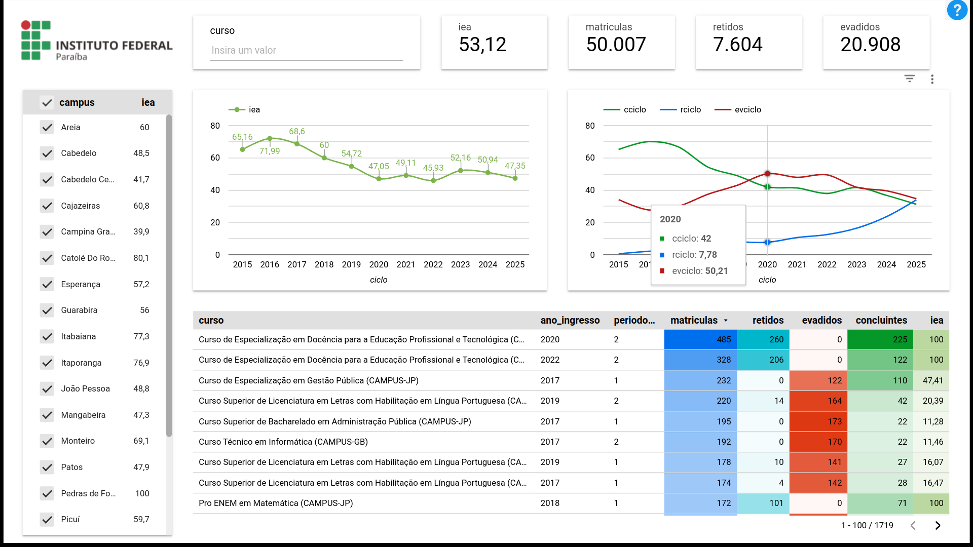 Já o acompanhamento do Índice de Eficiência Acadêmica (IEA) revelou uma inversão preocupante após a pandemia, com índices de evasão superando os de conclusão em diversos cursos — um alerta importante para ações de combate à evasão.