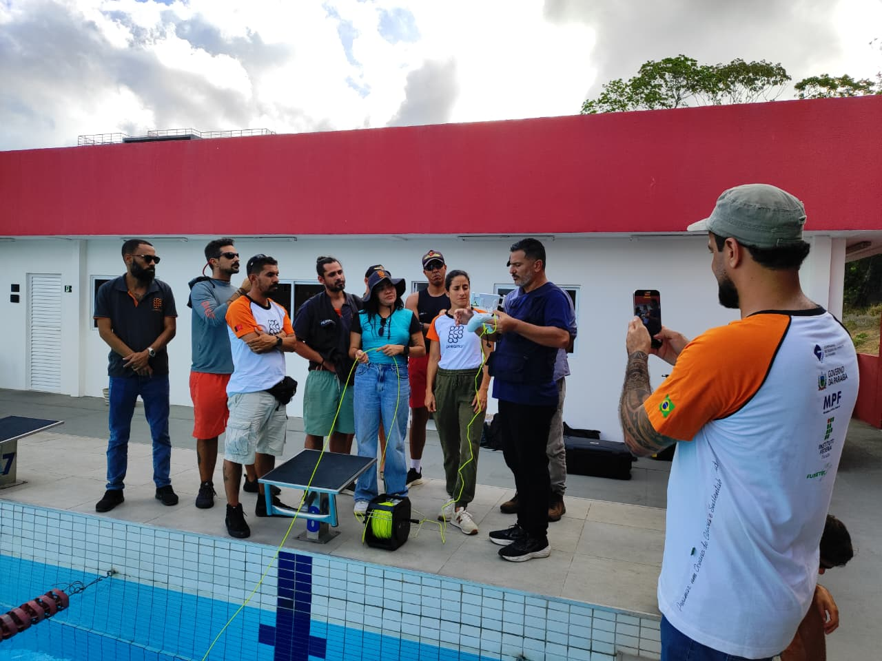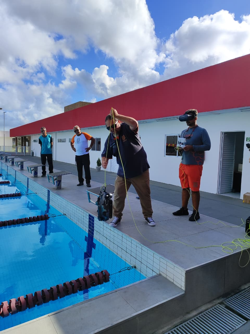 A parte teórica aconteceu no Campus Cabedelo Centro do IFPB, onde a equipe recebeu instruções sobre os comandos, protocolos de segurança e funcionamento dos acessórios do ROV. Ainda na quarta-feira (26/11), os pesquisadores seguiram para a piscina do Quartel do Corpo de Bombeiros da Paraíba, onde realizaram a primeira prática em ambiente controlado.