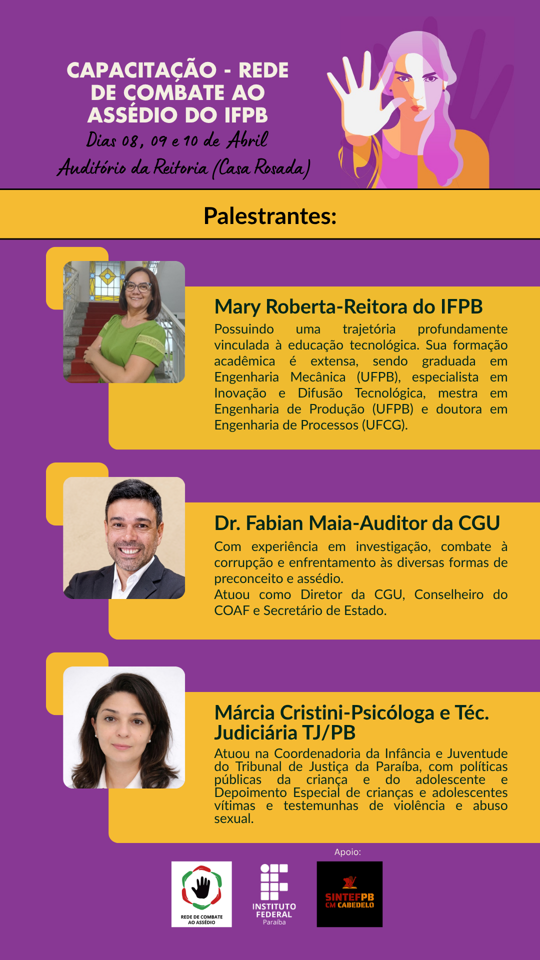 A Comissão Central de Combate ao Assédio do Instituto Federal da Paraíba (IFPB) realiza, de 8 a 10 de abril, a primeira capacitação de 2026. O evento ocorre no auditório da Reitoria (Casa Rosada), em João Pessoa, e marca o início do cronograma anual de fortalecimento das políticas de integridade da instituição.