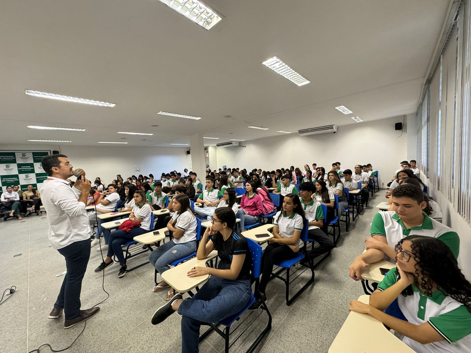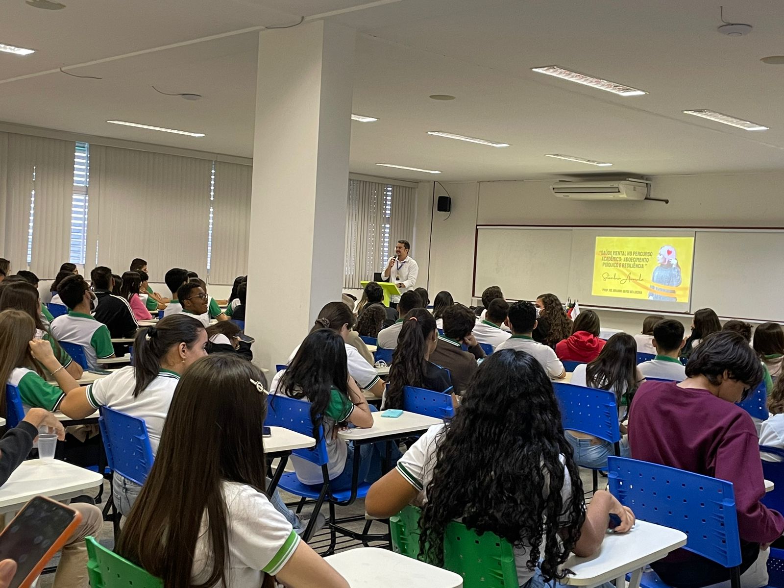 A programação iniciou-se com os estudantes dos cursos integrados com uma palestra do psicólogo Bruno Alves de Lucena que teve como título: Saúde Mental no percurso acadêmico: adoecimento psíquico e resiliência.