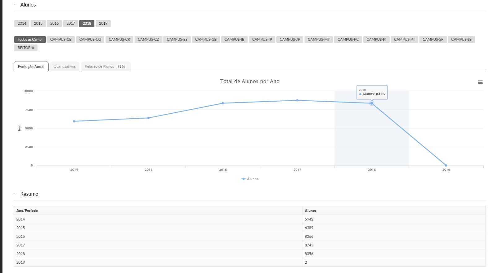 Quadro estatístico com evolução do quantitativo total de discentes ingressantes na instituição entre os anos letivos de 2014-2018.