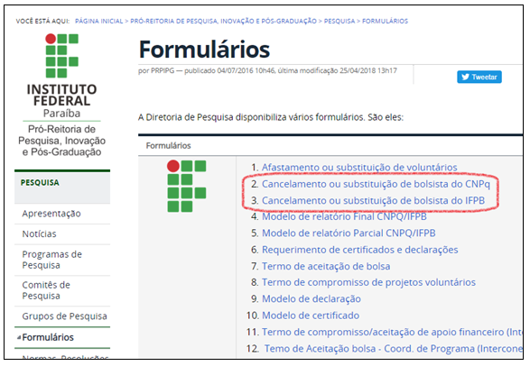 1 . Preencha o formulário “Cancelamento ou substituição de bolsista”, disponível na página Formulários do site da Diretoria de Pesquisa.