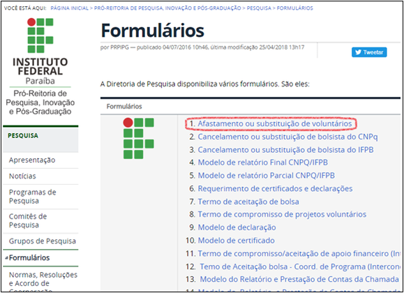 1 . Preencha o formulário “Afastamento ou substituição de bolsista”, disponível na página Formulários do site da Diretoria de Pesquisa.