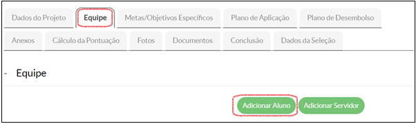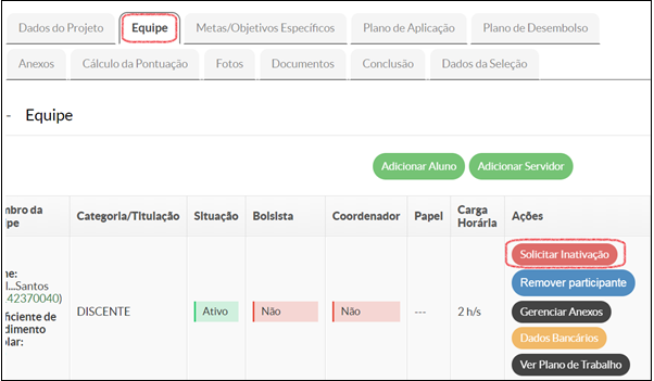 3. Na aba “Equipe” solicitar a inativação do discente voluntário: