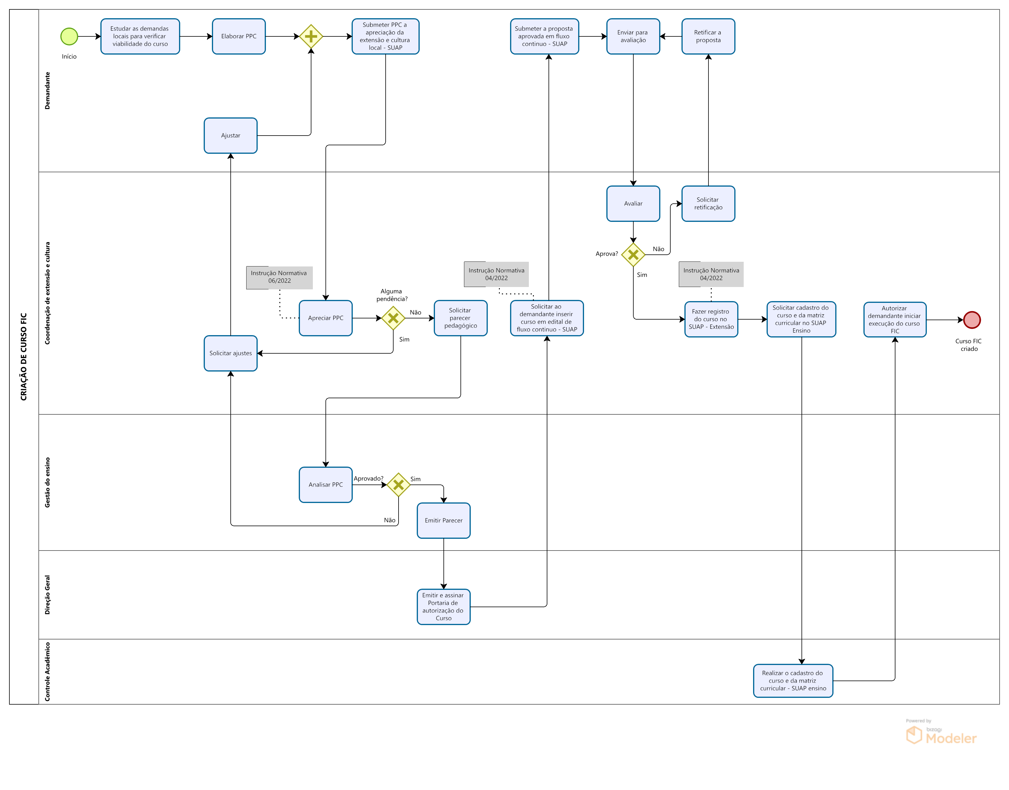 Com a portaria de autorização, a gestão da extensão e cultura solicita do demandante a inserção do curso FIC no edital de fluxo contínuo no SUAP, após esses procedimentos e sem necessidade mais de alteração, a coordenação de extensão e cultura faz o registro da atividade de extensão e cultura no SUAP módulo extensão.