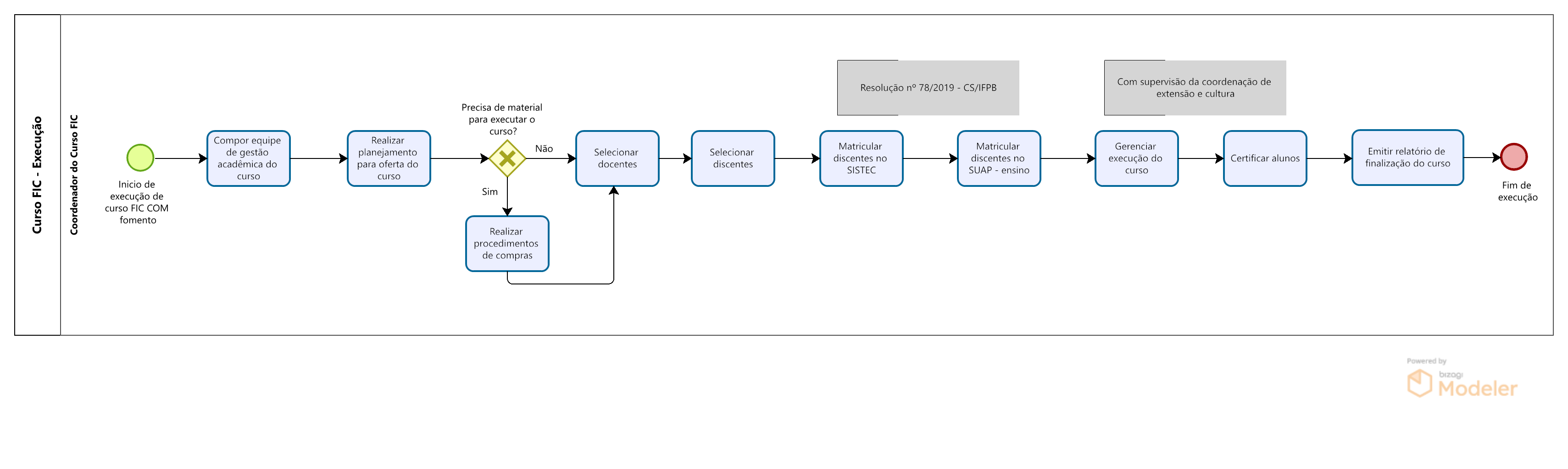 Este processo inicia-se com a composição da equipe de execução, e segue para o planejamento da oferta do curso FIC, alguns cursos precisam de aquisição de material e ou serviço e sendo assim deve passar pelo processo de compras e seguir para seleção de docentes, seleção de discentes e para a matrícula dos discentes nos sistemas gerenciais do IFPB, o SUAP e do MEC, o SISTEC, e com isso parte para a gerencia do curso e por fim certifica os discentes e encerra com a emissão do relatório de finalização do curso FIC.