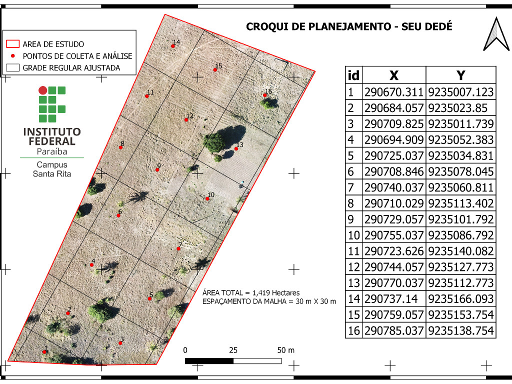 Para a execução do projeto, foram realizados levantamentos aerofotogramétricos, com o auxílio de Veículos Aéreos Não Tripulados (VANT), objetivando delimitar a área de interesse, o gradeamento e os pontos regulares para coleta e posterior análise do solo.